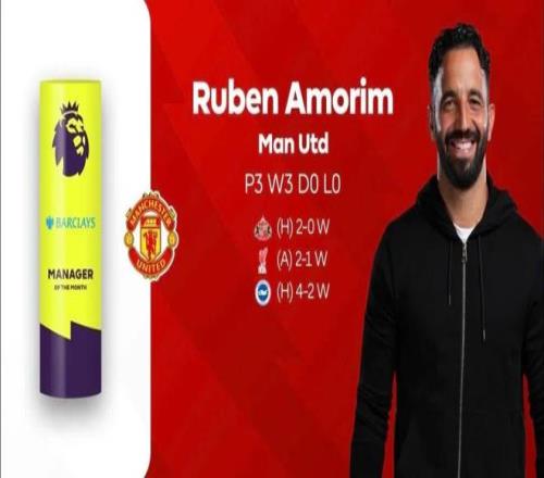 阿莫林入围英超10月最佳教练候选名单,曼联在10月的3场比赛中都拿到了胜利。