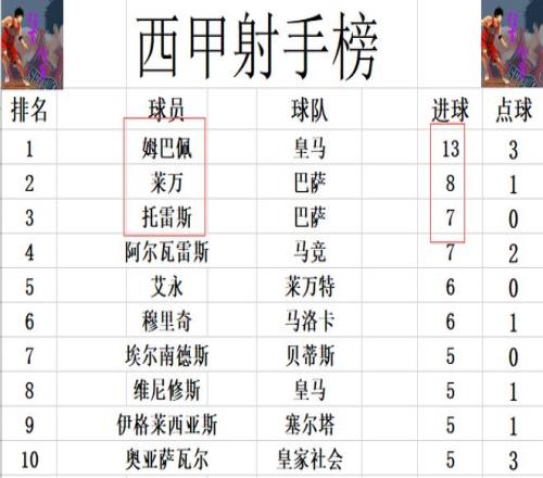 射手榜方面,姆巴佩12轮打入13球高居榜首,莱万今天闪击破门继续追赶,8球独居第2。托雷斯梅开二度追上阿尔瓦雷斯,两人7球并列第3。维尼修斯,奥亚萨瓦尔等人5球刚好挤入前十。